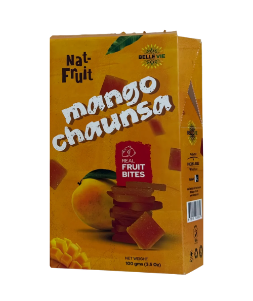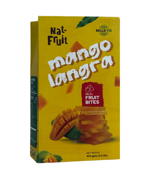 Belle Vie Nat-Fruit Real Fruit Bites bring the authentic taste of premium Pakistani mangoes to your snacking routine in two beloved varieties — Langra and Chaunsa. Langra is celebrated for its rich, distinctive aroma and tangy-sweet intensity, while Chaunsa is prized as the king of Pakistani mangoes for its smooth, buttery sweetness. Each 100 g pouch is made from real mango puree, shelf-stable and ready to enjoy anytime. With zero fat, zero sodium, no artificial flavors or colors, and just 80 calories per serving, these fruit bites are a natural, guilt-free snack perfect for lunchboxes, travel, or a sweet treat at home. Non-GMO and Halal certified. Every pack delivers the concentrated goodness of 1,000 grams of fresh mango. Manufactured by Focus & Rulz Healthcare, Pakistan. Distributed exclusively in North America by Mamoojan Com Inc.
